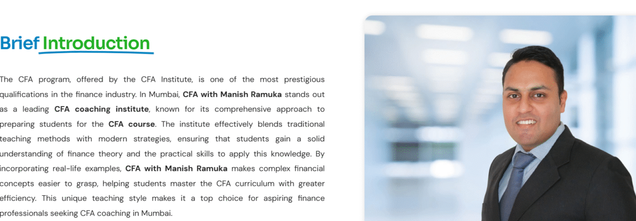 So, second on the list is Manish Ramuka CFA classes in Mumbai. Although, I don’t know Manish ramuka personally, but on close analysis the trainings and other parameters point his classes in rank number 2 for cfa classes in Mumbai.