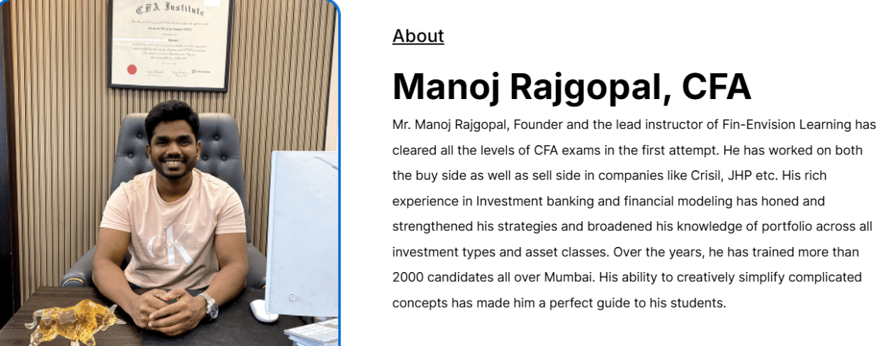 So, coming in as the top 4th ranking CFA Classes in Mumbai, is finvision. So, I happen to also have worked with Manjoj, while he used to train in 2018 in IMS Proschool, thane. Also, one of the main reasons, why I am ranking his institute, is because of his teaching quality.