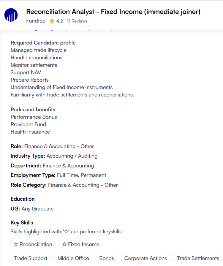 - Reconciliation Analyst- Fixed Income, Fundtec